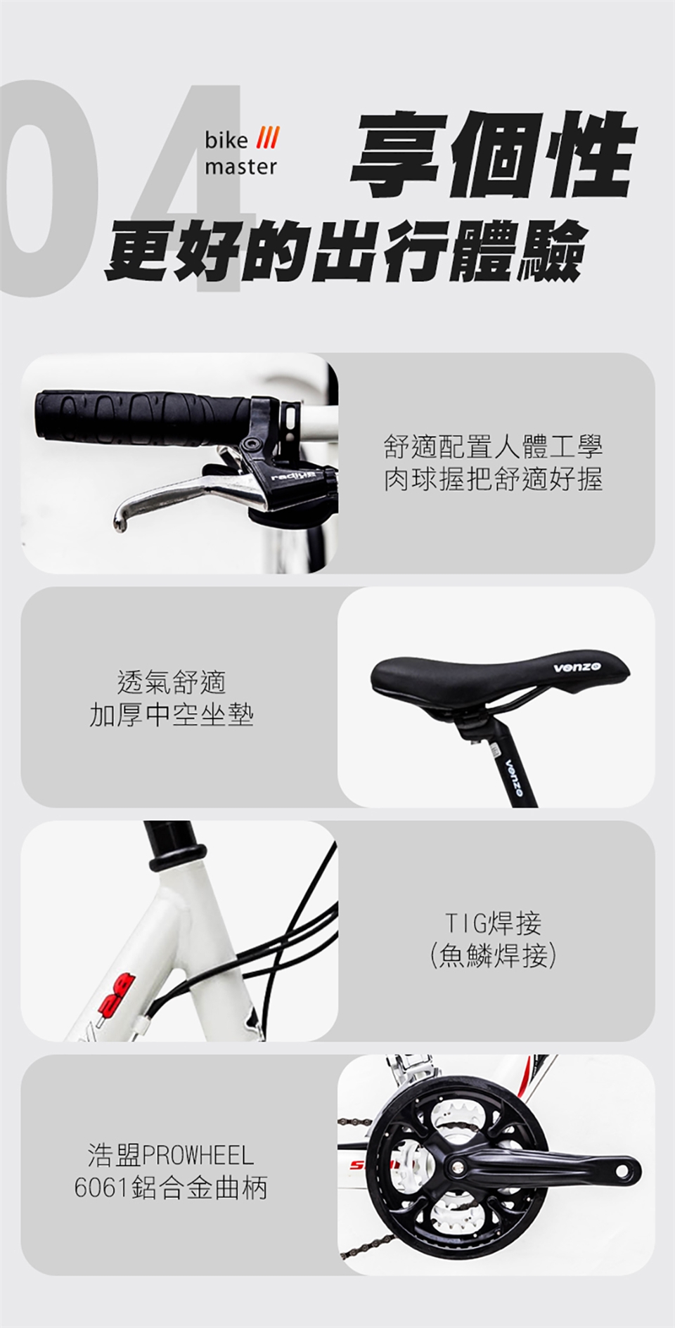 座桿:鋁合金27.2 32CM 快拆式伸縮座管,可依騎乘者身高調整高度及角度