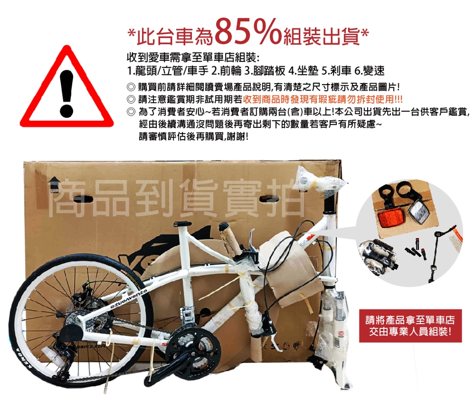 出貨前  85%組裝出貨; 出貨前調整變速剎車輪胎打氣....消費者收到單車後待組合龍頭前輪就可以騎乘了 !!