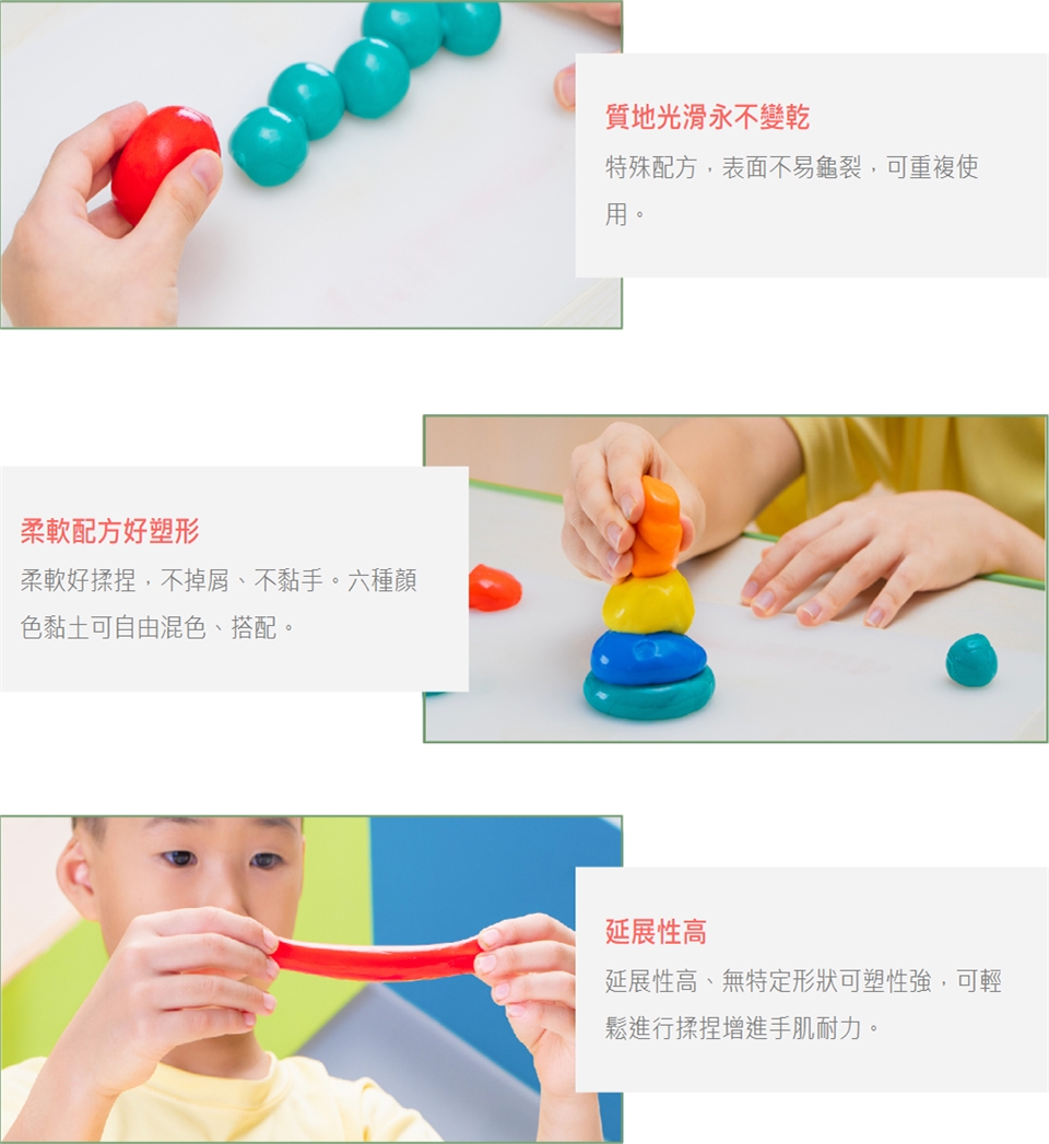 透過手部揉捏黏土刺激學習,增強手部肌肉耐力打造手腦協調性,激發兒童想像力和創造力。