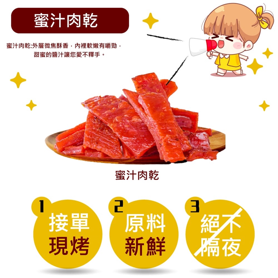 1.蜜汁黃金條 150gx1+蜜汁肉乾 150gx1