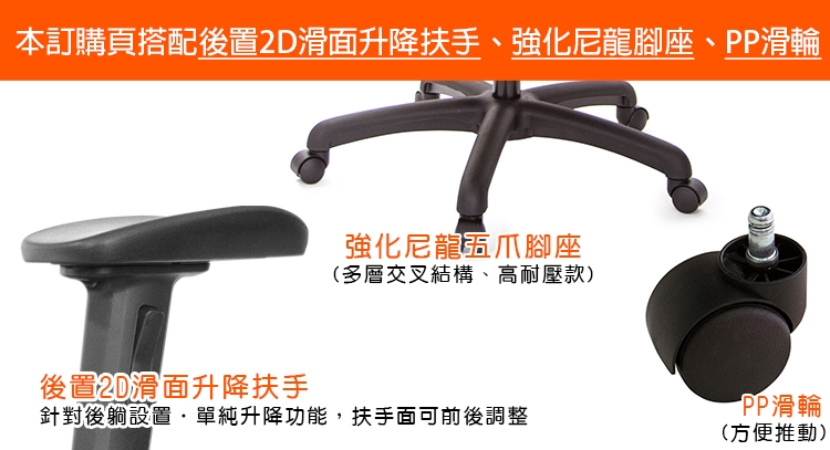本訂購頁規格:後置2D升降滑面扶手、尼龍腳座、PP滑輪
