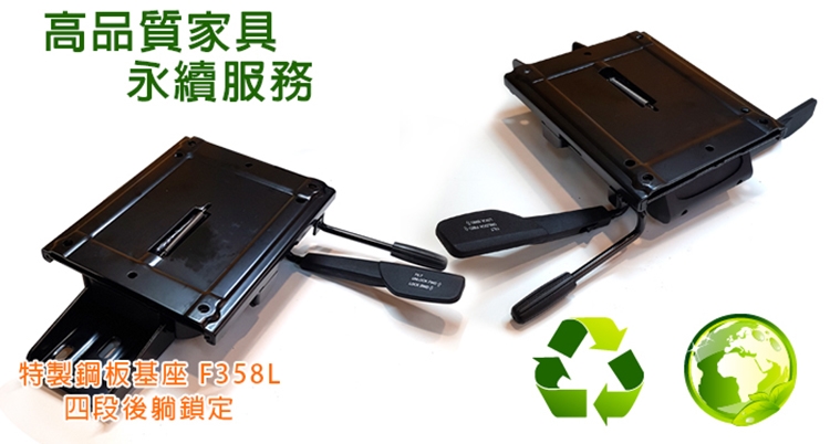 本款坐墊底盤使用F358L分離式鋼板基座,座墊深度可調整5CM,可四段後躺固定,依自己喜好故定角度,或不固定隨時可彈力後躺雙功能;懸臂機構在後躺時,重心平穩,能防止翻倒。
