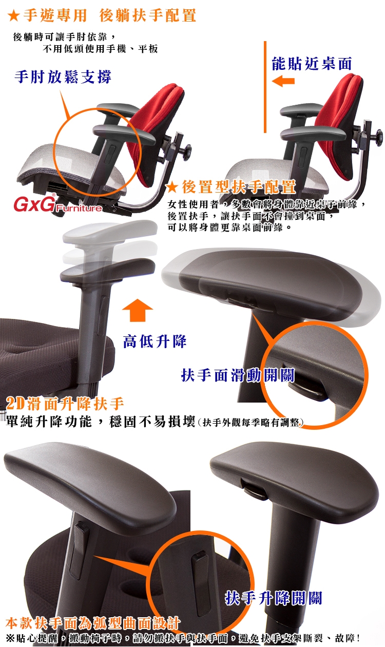 本款搭配HR-003升降扶手, 後置扶手設計,針對大多數女性使用者,喜歡將身體靠近桌面,一般扶手為前置,較容易撞到桌面,後置扶手可以避免撞到桌面,將身體更貼近桌面前源,後躺時,能讓手肘輕鬆後靠,閱讀書籍、使用平板手機,更輕鬆舒適。