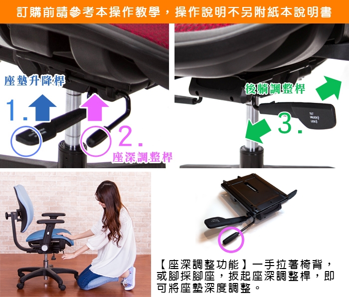 1.座椅高度︰調整高度時,人請先離開座墊,在將拉桿拉起,即可將座墊昇起,若需調降高度,人則需坐在座墊上,在將拉桿拉起,透過身體重量,座面高度即可下降。
