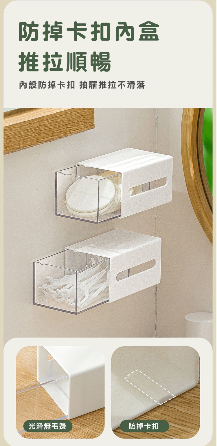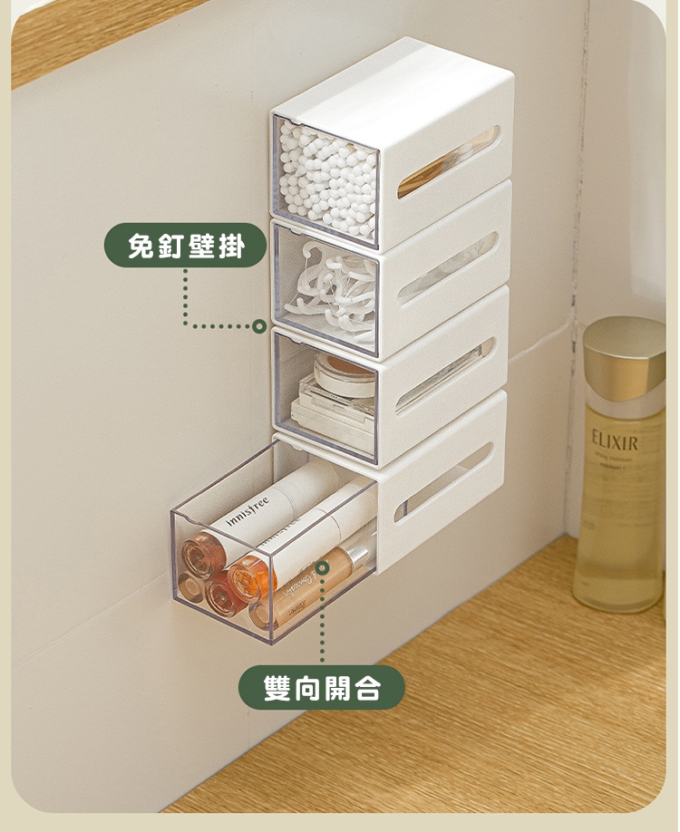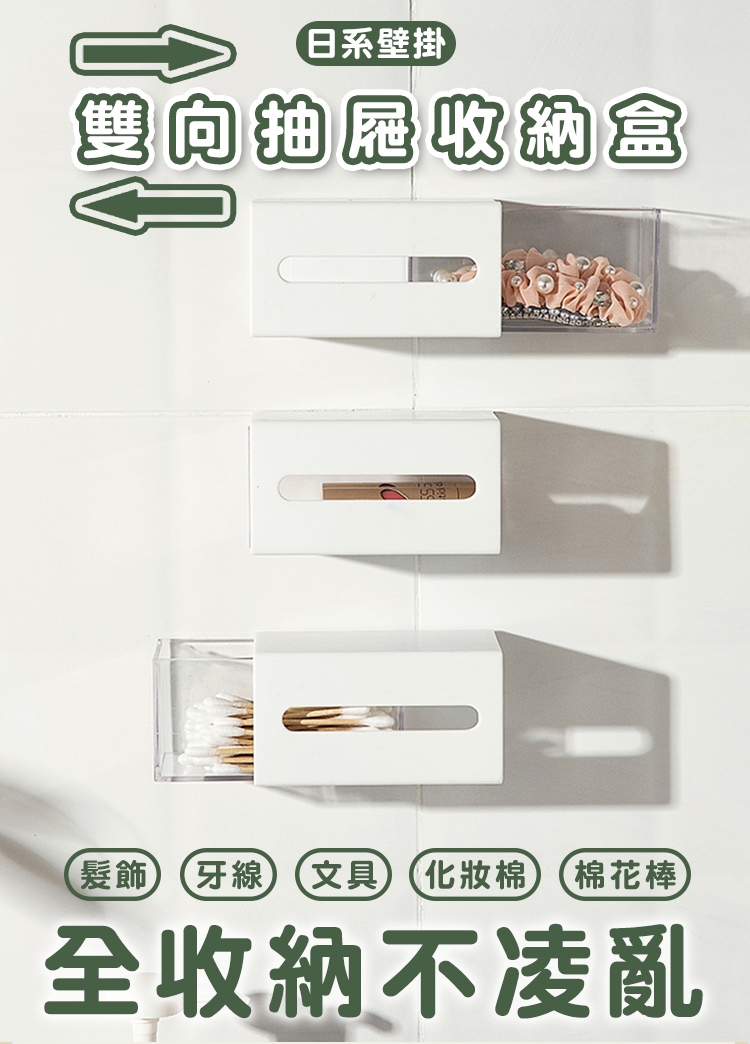 雙向壁掛抽屜收納盒,選用優良ABS及PS材質,免釘鑽壁掛設計,拓展牆面收納功能,雙向抽屜左右可開,不受空間限制,內設防掉卡扣,抽屜推拉不滑落,置於浴室可收納棉花棒、化妝棉,髮圈等,不畏水氣,置於桌下也可當小抽屜,文具、充電線等,抽屜透明可視,取物便捷無需翻找,規整常用小物,隨手取用整潔又便利!
