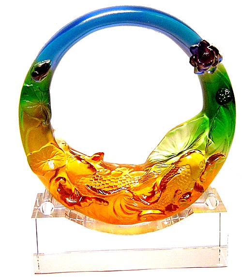 材質:精緻脫臘琉璃手工藝術品,金魚悠遊於彩虹池,,代表著源源不絕的財富以及如魚得水的人際關係。