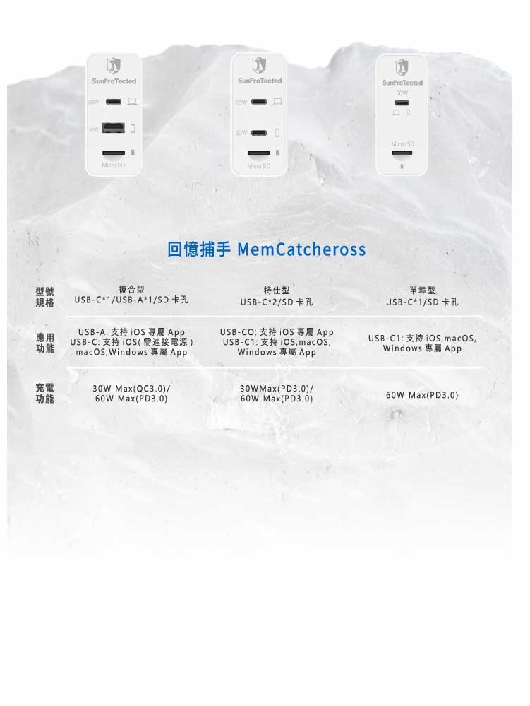 ▌「回憶捕手 MemCatcher Cross」- 特仕型 ( USB-Cx2 ) 共有三種型號,分別是「復合版」、「特仕版」與「單埠版」,三者差別於「USB輸出埠」,用戶可以根據自身設備連接埠需求挑選產品。*單埠版不開放預購 !