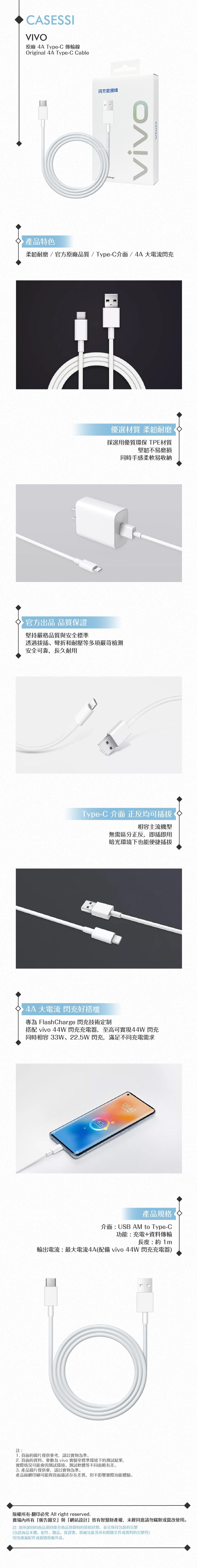 本商品VIVO 4A 原廠盒裝 Type C 閃充充電線_44W(11V/4A) Max,