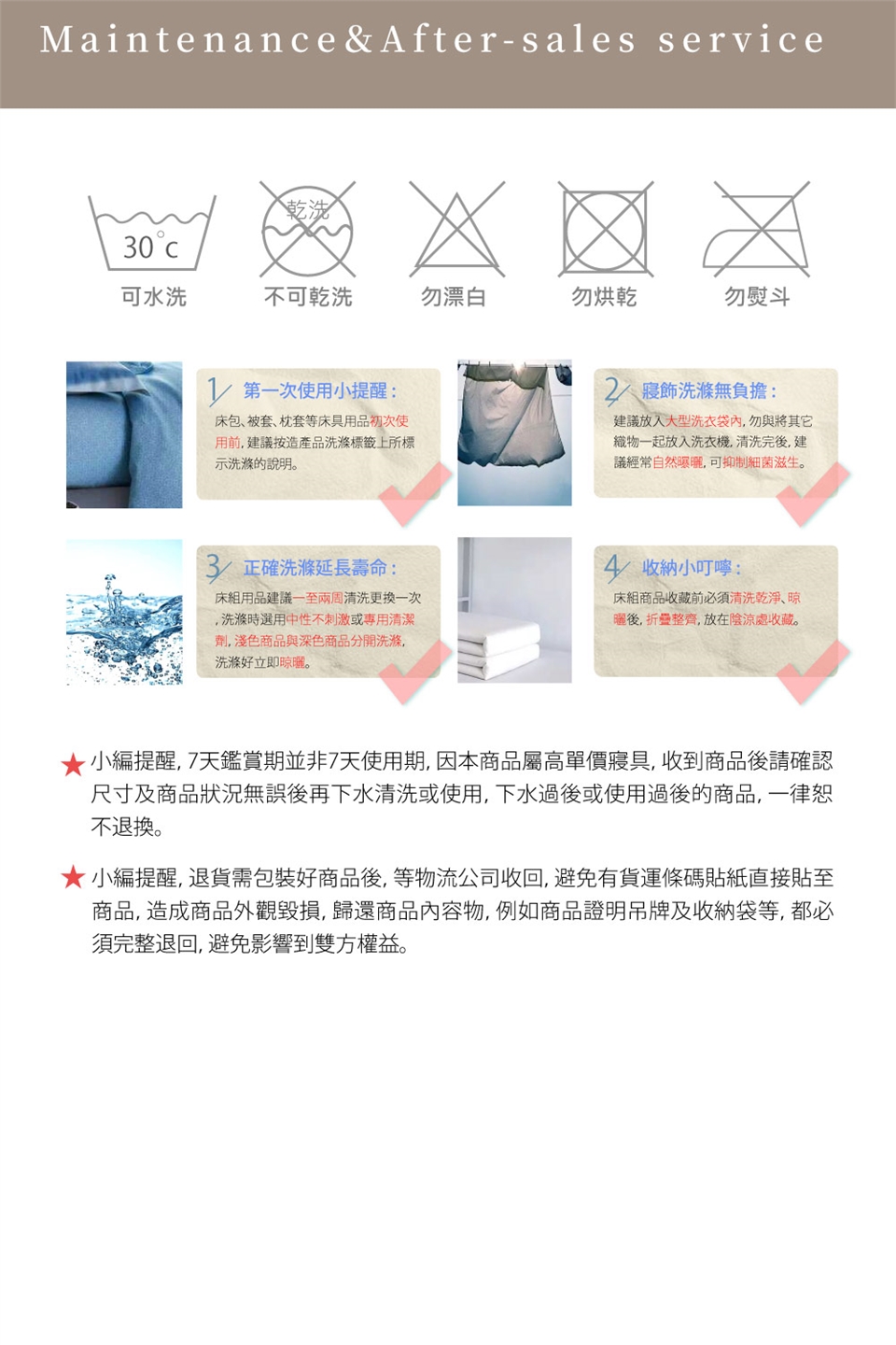 *小編提醒,7天鑑賞期並非7天使用期,因本商品屬高單價寢具,收到商品後請確認尺寸及商品狀況無誤後再下水清洗或使用,下水過後或使用過後的商品,一律恕不退換。