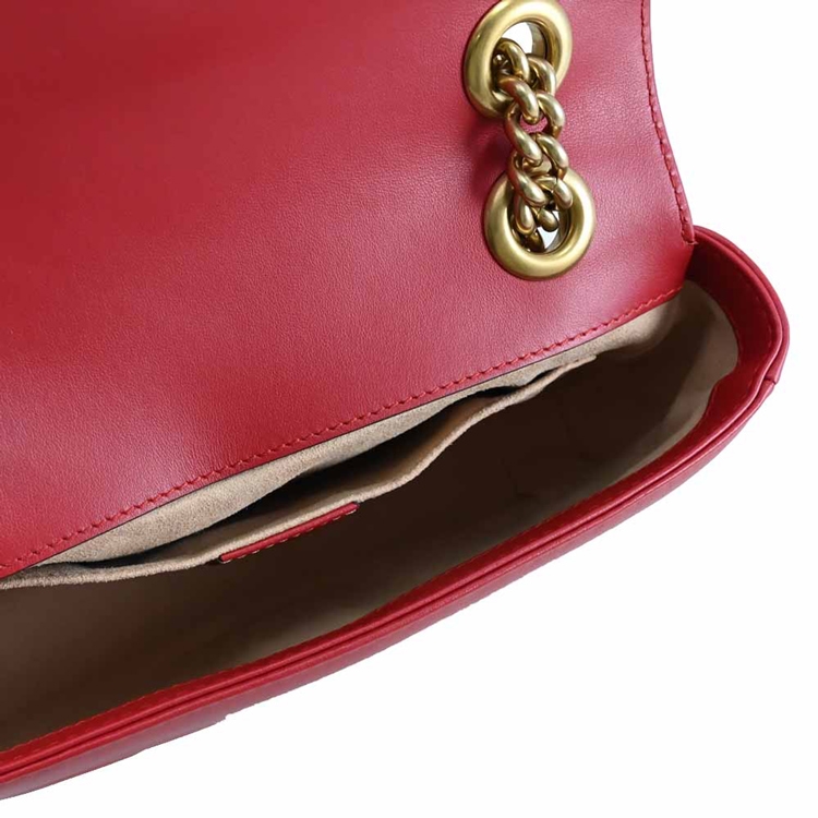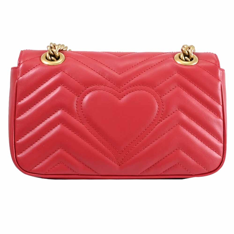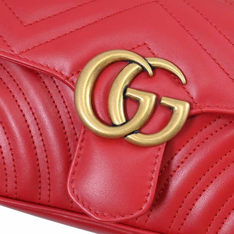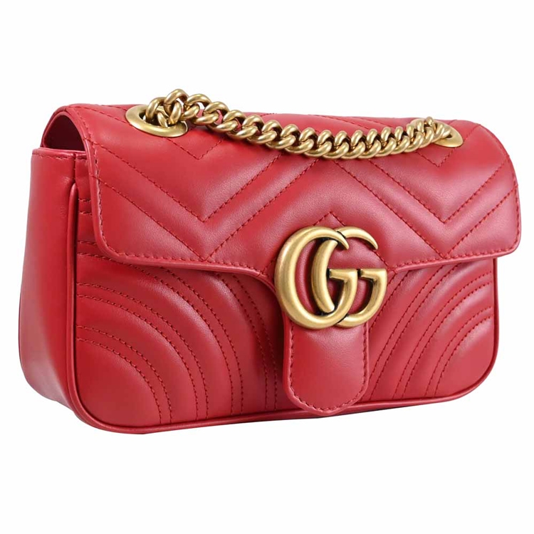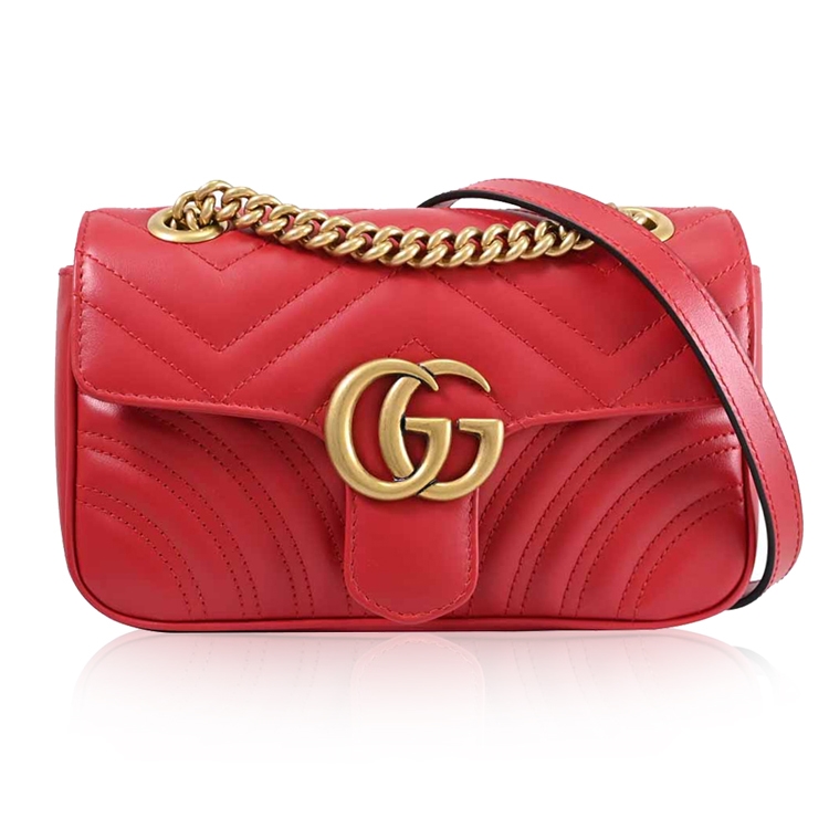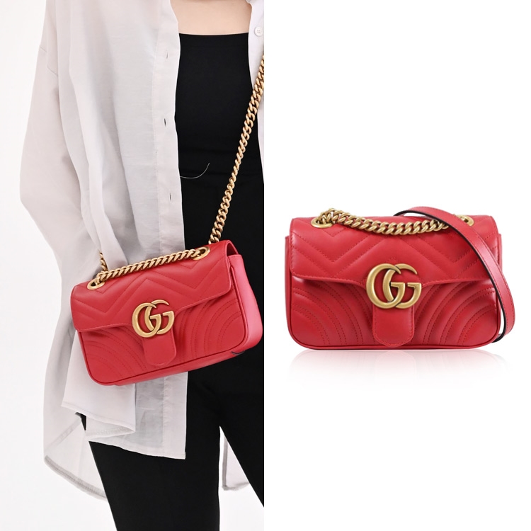 GUCCI 是義大利品牌,以經典雙G LOGO緹花的設計著名,也是辨識度極高的品牌,其魅力在台灣持續燃燒,高貴優雅的的熱銷款式,是許多人踏入名牌世界的第一選擇,除了超Hot的熱賣商品持續銷售外,也在新品上不斷創新,GG Marmont系列肩斜鍊包,採用採用金屬雙G LOGO扣飾造型加上經典絎縫Chevron皮革材質/麂皮質感微纖維襯裡材質,翻蓋扣式開口/內有1貼袋,內可放長夾及手機等小物,是近年最夯的小包系列,精緻古典,簡約時尚,展現俏麗、摩登的雙重時尚感!