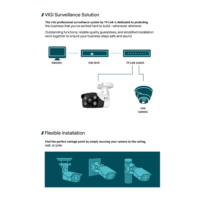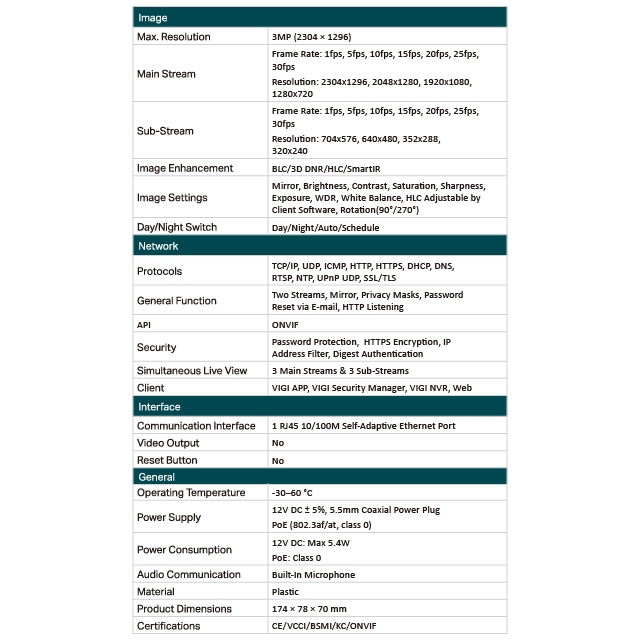 -彈性管理:透過四種方式完全管理您的環境安全:網頁、NVR UI、VIGI App、VIGI Security Manager 軟體管理程式。 3MP --高畫質解析度:攝影機俱備 3MP 解析度 - 更高的解析度得以捕捉更細緻的細節。