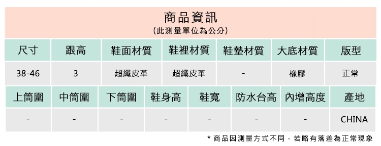 2.鞋類商品依功能及用途之不同,鞋底各有其止滑係數之個別不同,使用鞋類商品請用於正常平坦之路面,非雨鞋或雨靴類商品,請避免穿著於下雨濕滑路面上行走。