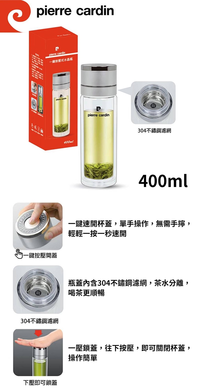 pierre cardin 皮爾卡登 一鍵按壓式304不鏽鋼濾網水晶瓶 400ml PCJR-320