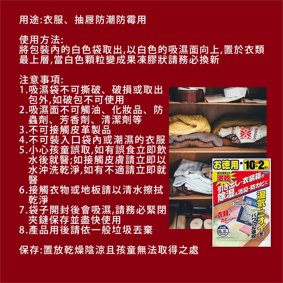 激乾除濕包12袋入(抽屜、衣櫃專用) ※每入除濕量55克※