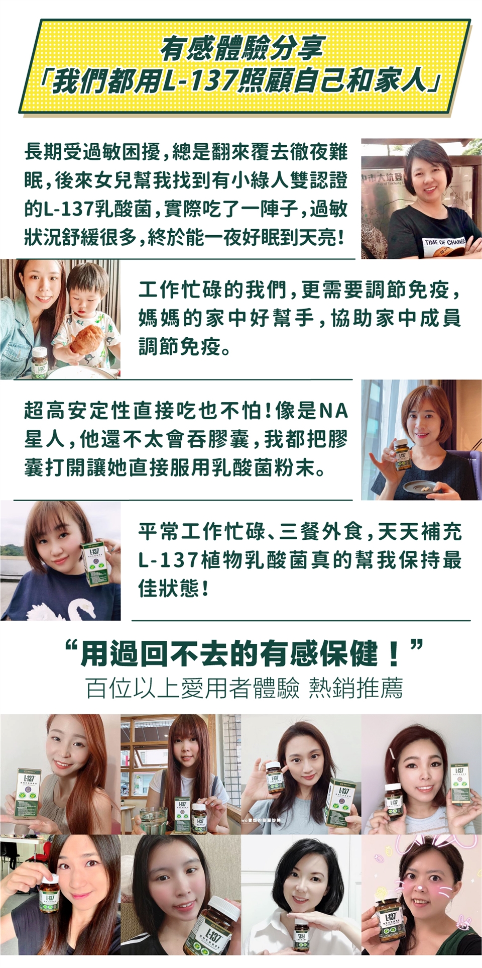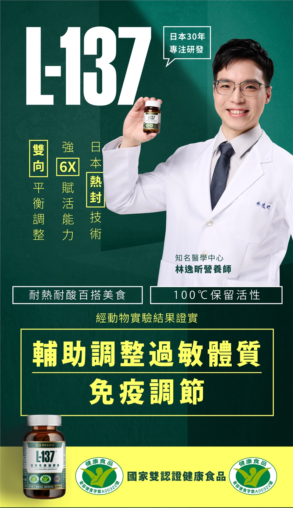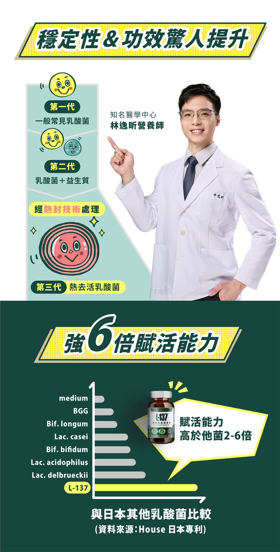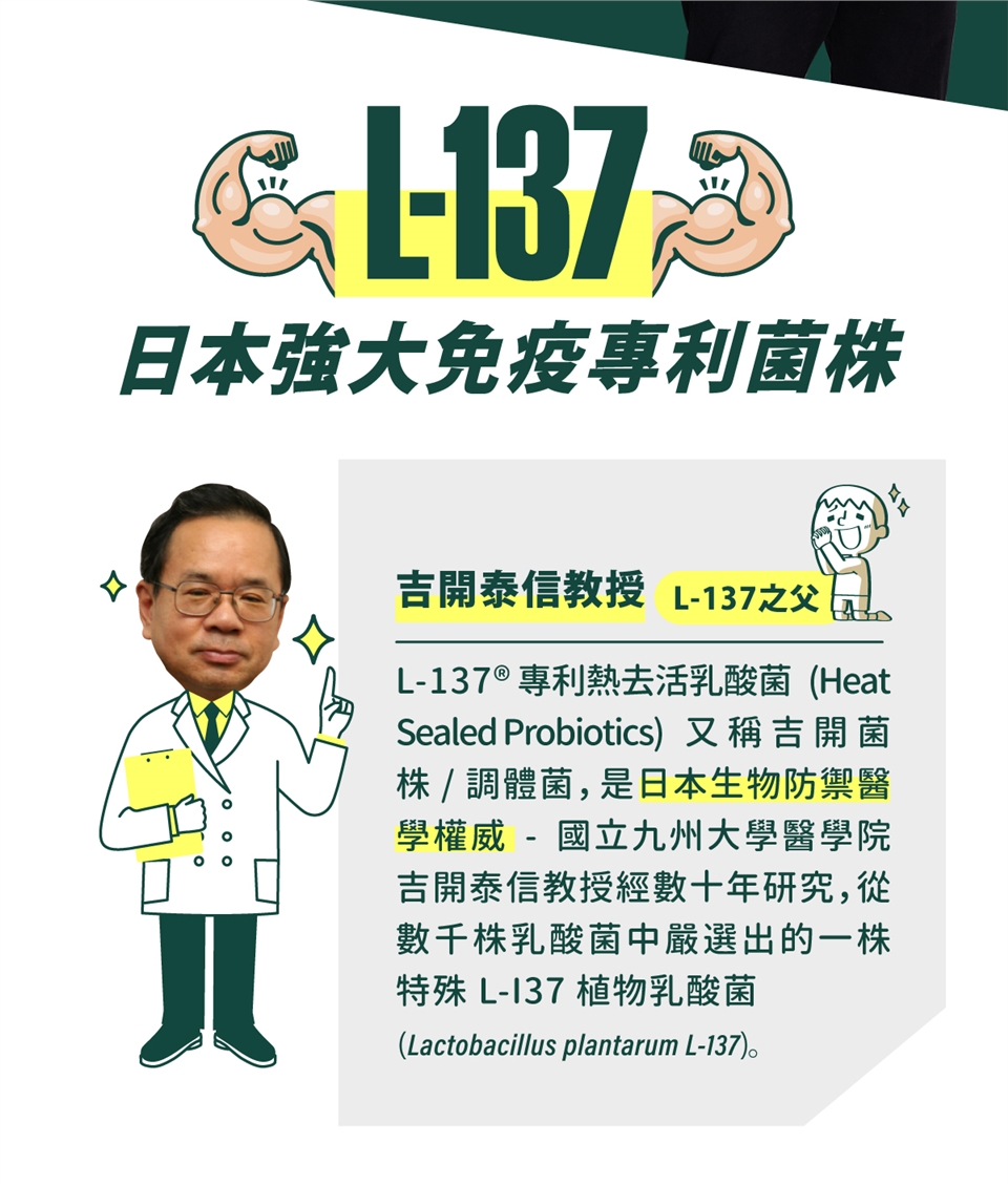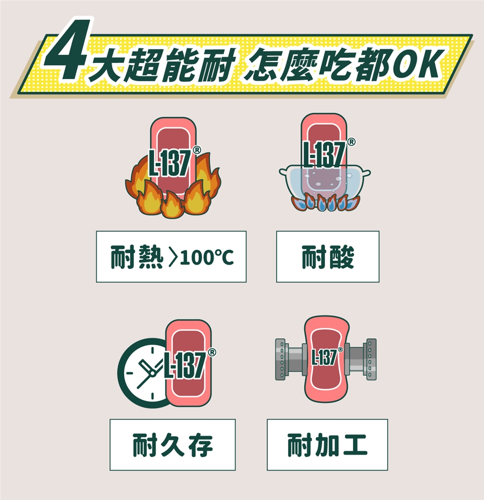 L-137 第三代乳酸菌不是為了取代一、二代的活菌,是為了補強它們不耐熱、不耐酸、不耐久存所引起的作用效率不佳,以及擴展活菌無法應用的產品型態,因此單獨使用 L-137 很好,也可搭配活菌,讓好菌更好。