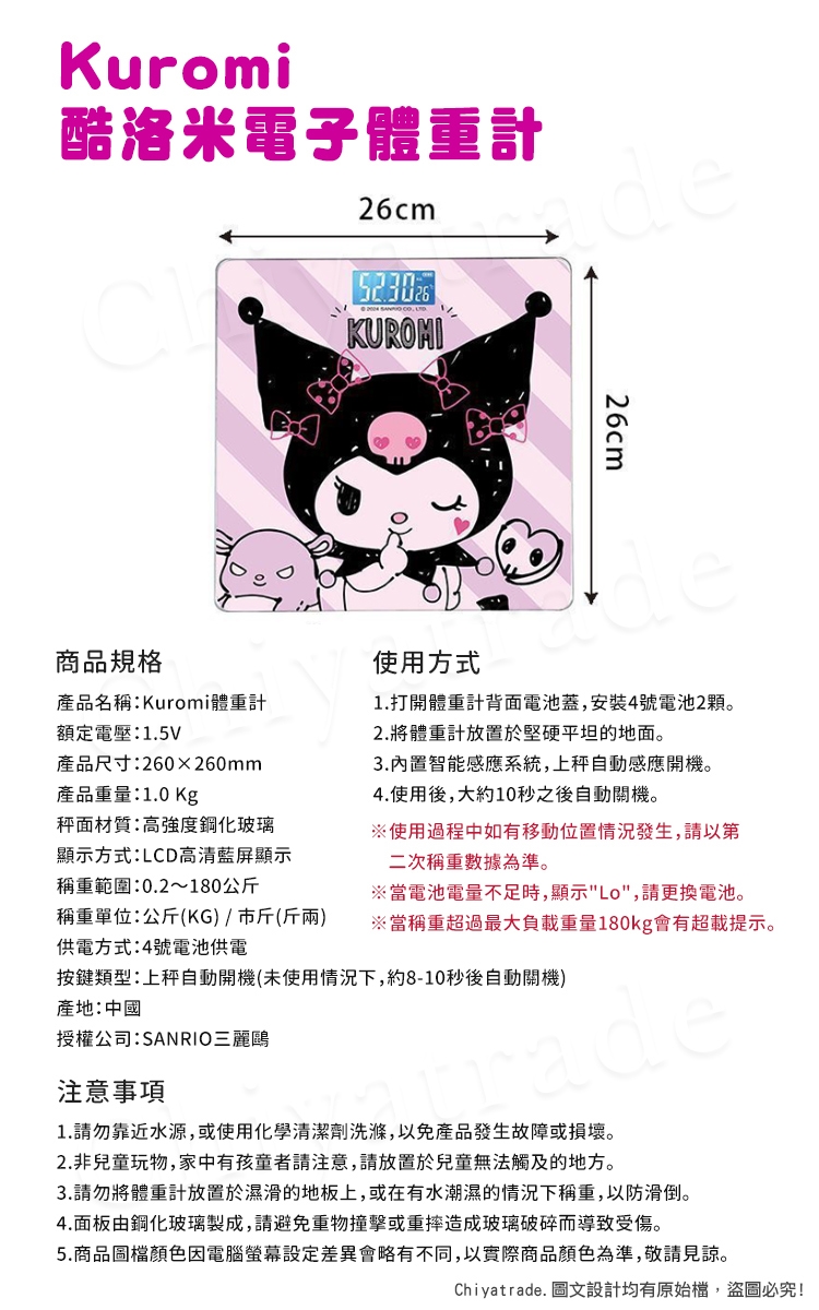 3.請勿將體重計放置於濕滑的地板上,或在有水潮濕的情況下稱重,以防滑倒。