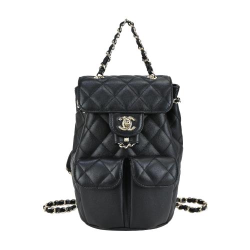 CHANEL 經典菱格紋小牛皮轉釦鏈帶雙口袋後背包(小號/黑色)