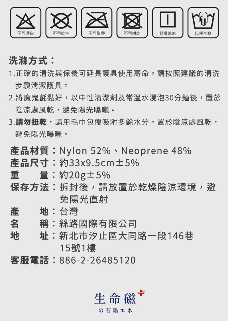 建議穿戴每2小時應卸下護具10分鐘,讓肌肉組織緩解恢復:若使用時感到不識,請立即停止使用。