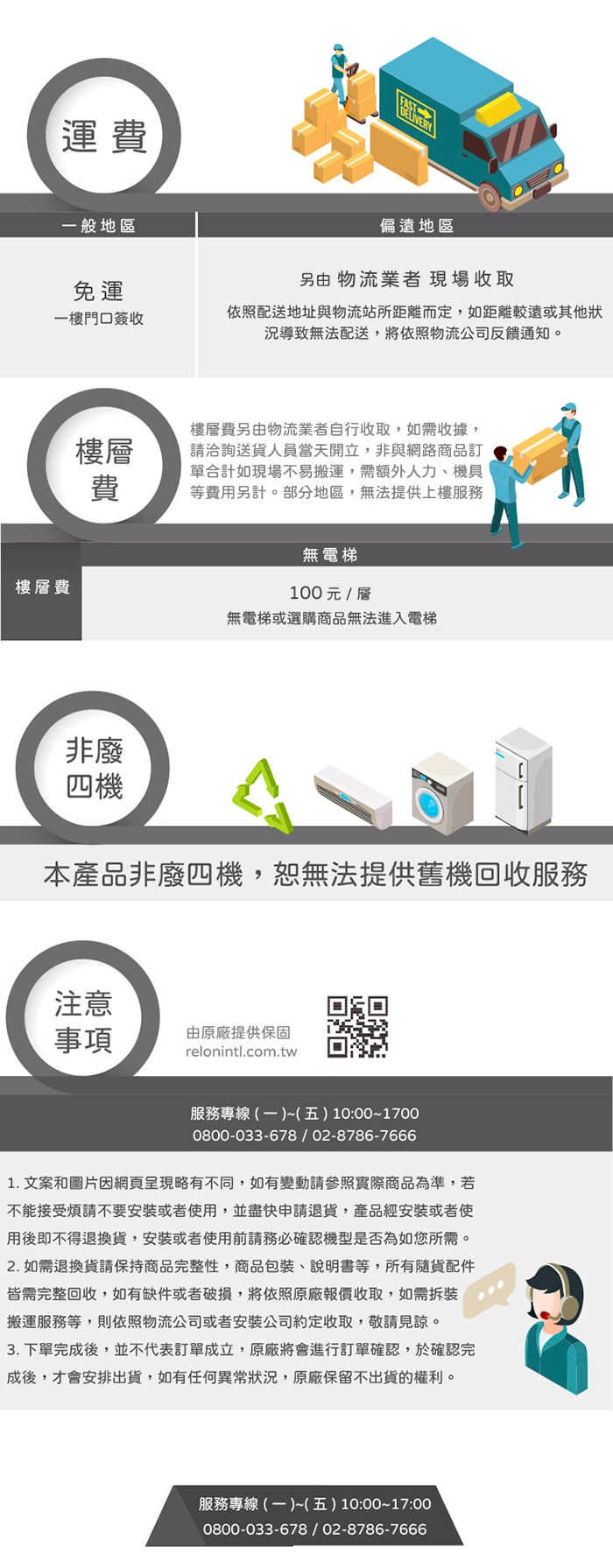 5.購買前須確認環境(空間/排水),如因環境因素產品無法安裝,仍會收取跨區費及樓層費,且將酌收單趟$500物流空趟費。