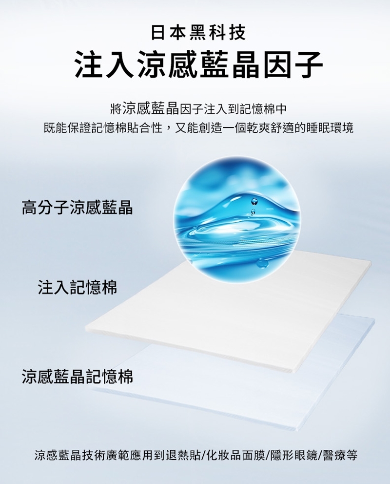 2cm藍晶靈涼感慢回彈記憶棉層密度:25kg/m3(±5%) + 8cm記憶支撐棉層密度:40kg/m3(±5%)