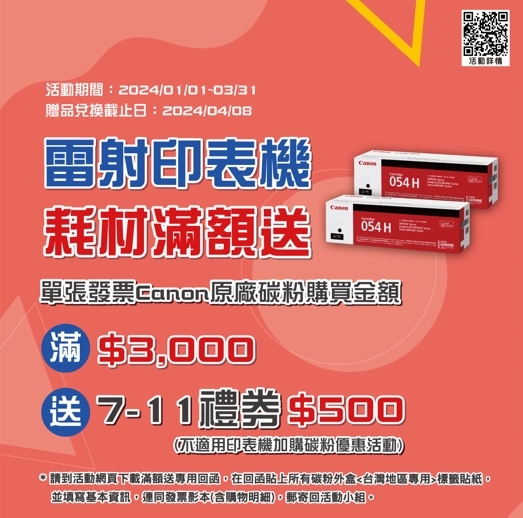 單張發票碳粉購買金額滿$3,000,送7-11禮券$500(不適用印表機加購碳粉活動),
