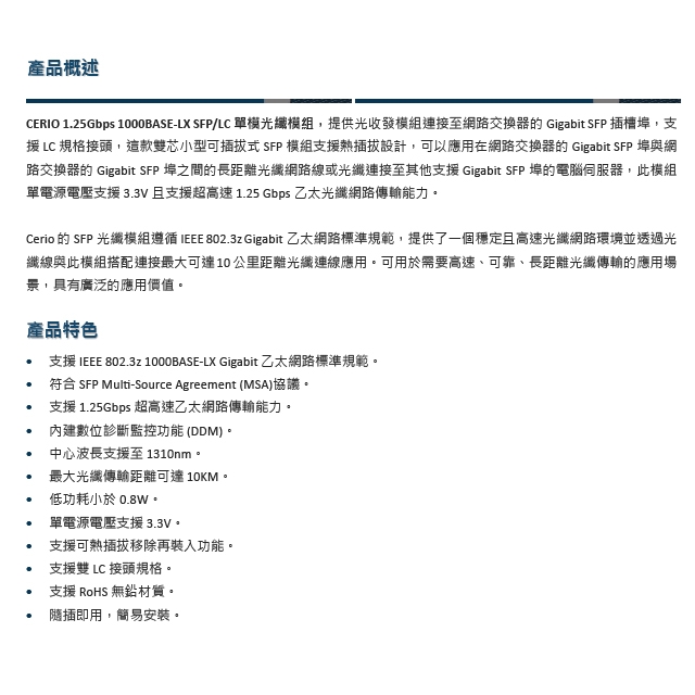 -支援 IEEE 802.3z 1000BASE-LX Gigabit 乙太網路標準規範。