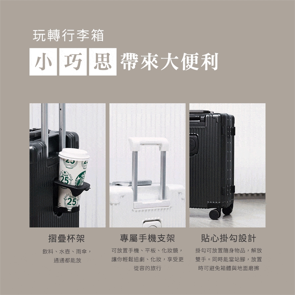 - 拉桿上有專屬手機支架,旅途中看手機追劇、看鏡子化妝,都方便