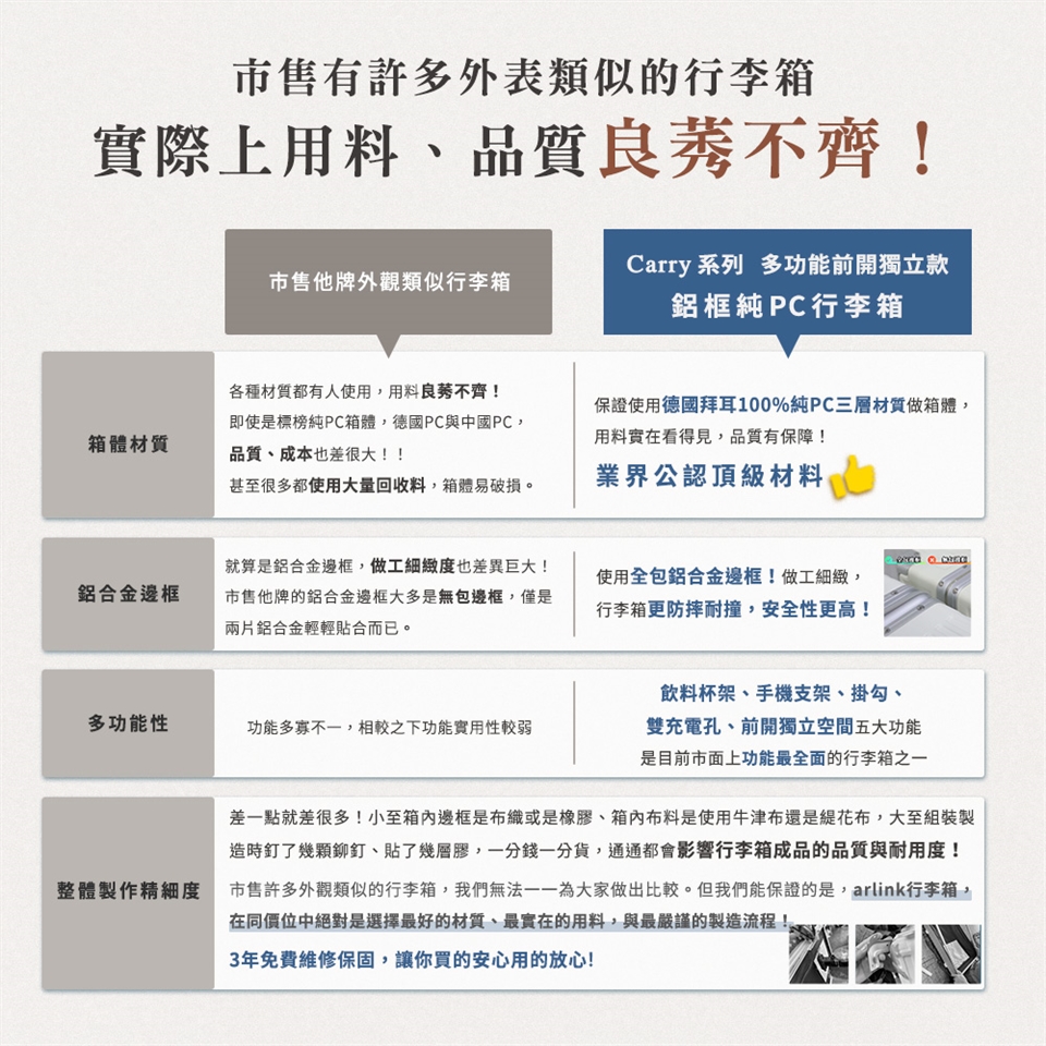 arlink【鋰石灰】20吋 多功能前開式 鋁框PC登機行李箱 ✈️旅行的品味,藏在每個細節裡: