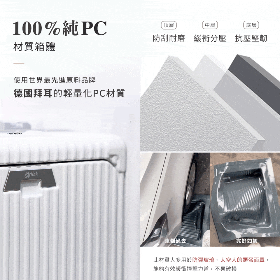 - 箱體是使用德國拜耳100%純PC材質,此材質多用於防彈玻璃、太空人頭盔面罩...等,因此能夠防刮耐磨,遇外力可快速回彈,拖運不易摔壞