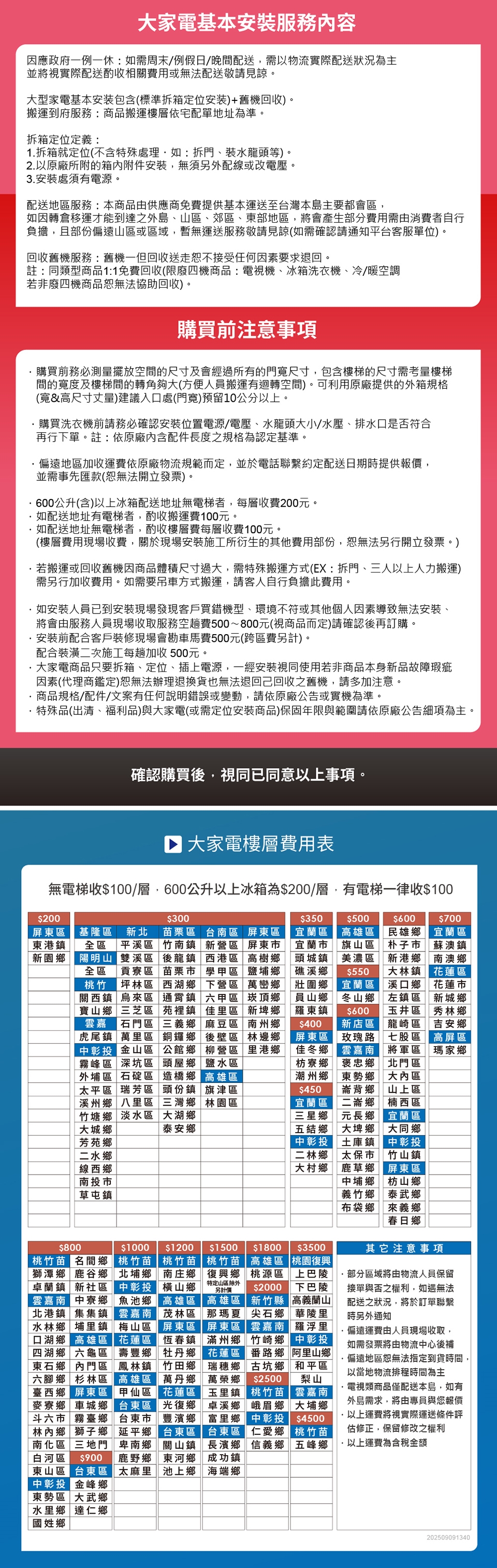-大家電(冰箱、洗衣機、電視、冷氣)一經簽收及拆封定位安裝視同使用,恕無法辦理退換貨