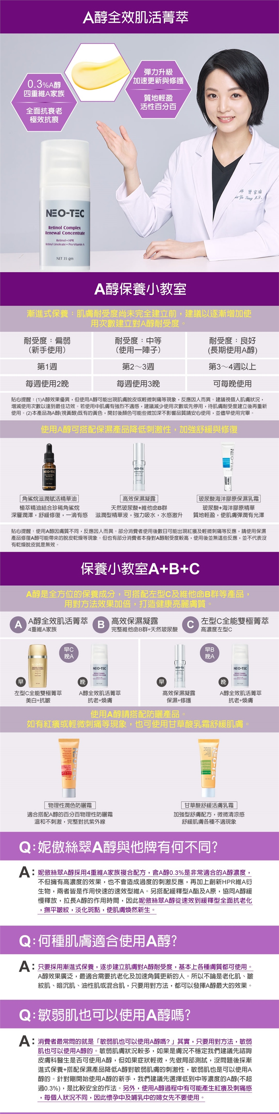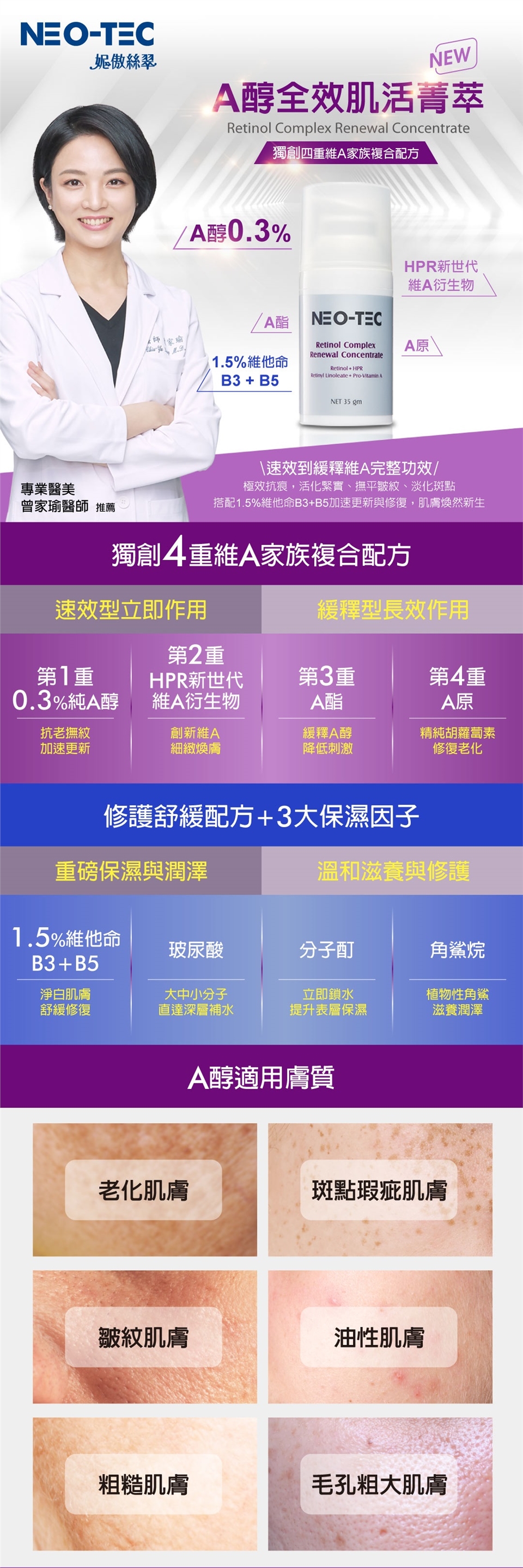 用途:獨創4重維A家族複合配方,A醇0.3%完美結合HPR創新維A衍生物,加上A酯及A原,提供速效到緩釋維A的完整功效,極效抗痕,活化緊實、淡化斑點;搭配1.5%維他命B3+B5舒緩肌膚,加速修復與更新,肌膚煥然新生。