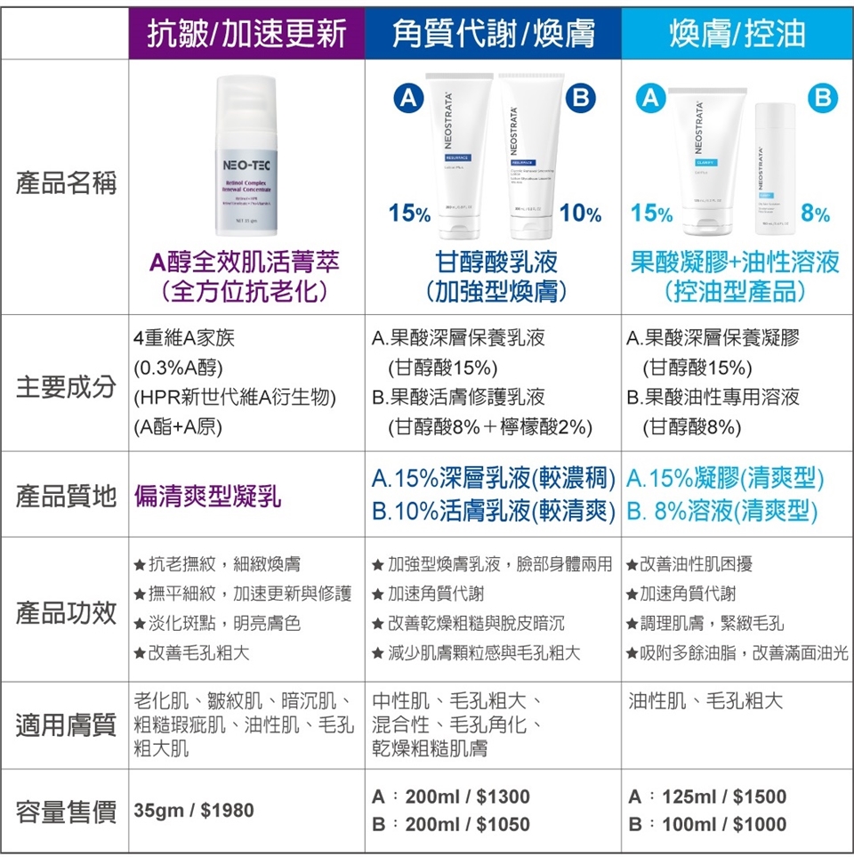 - 速效型A醇0.3%,深入肌底撫平細紋,全方位抗老化;同時加速角質更新,改善毛孔粗大