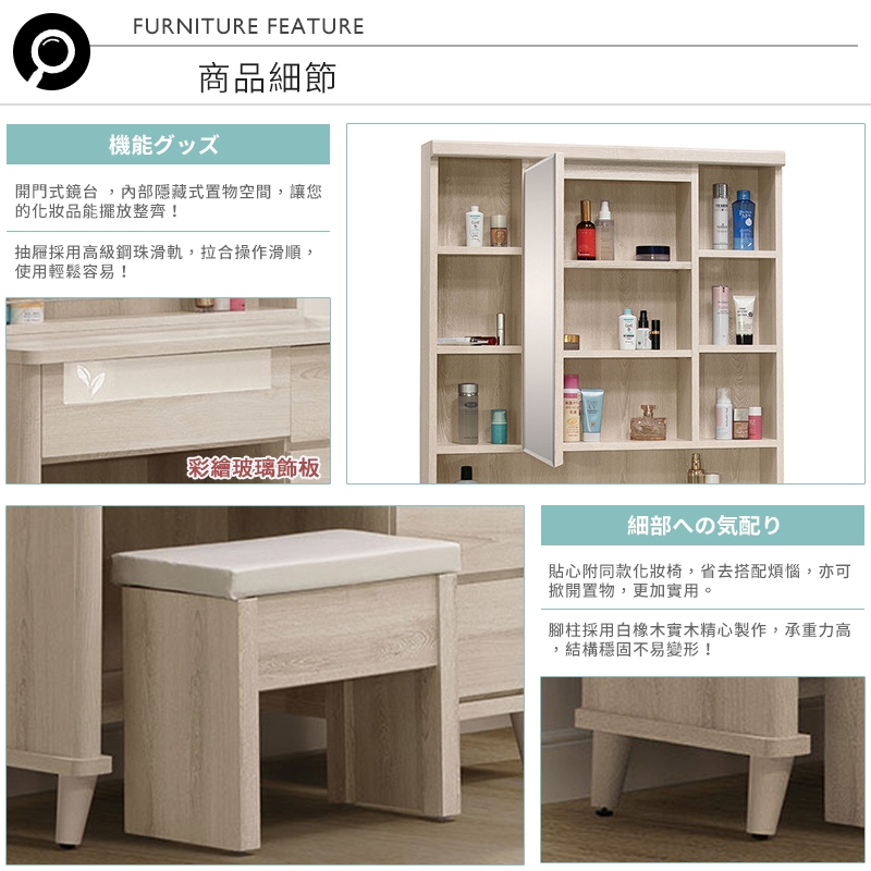 開門式鏡台,內部隱藏式置物空間,讓您的化妝品能整齊擺放!