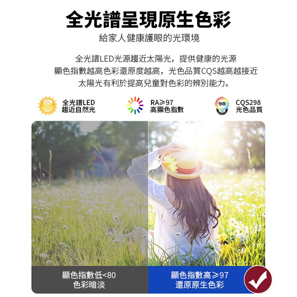 【這款燈采用高顯色芯片,全光譜護眼光Ra?97,能夠提供生動自然的光照,高度還原物體的色彩】