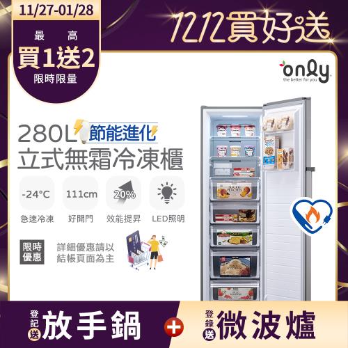 【農曆年前配送~倒數中!】only節能進化280L無霜冷凍櫃OU280-M06Z質感銀(節能標章/280公升直立式/年菜預購水產團購.鍋物烤肉組囤貨)