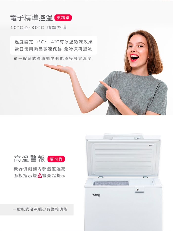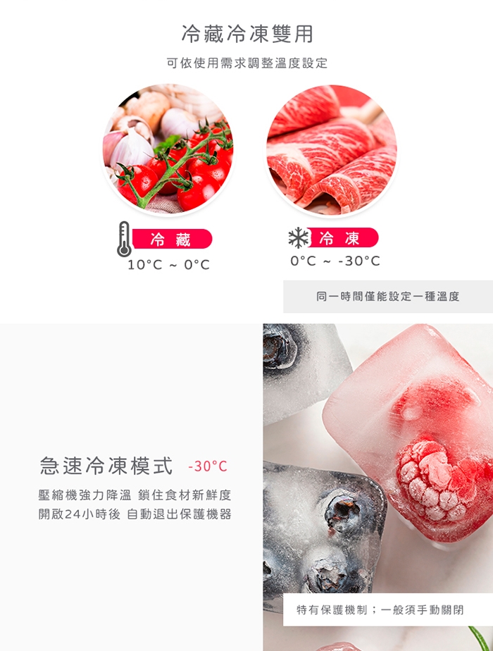 溫度調節:冷藏10~0°C;冷凍0~-30°C (預設-18°C)