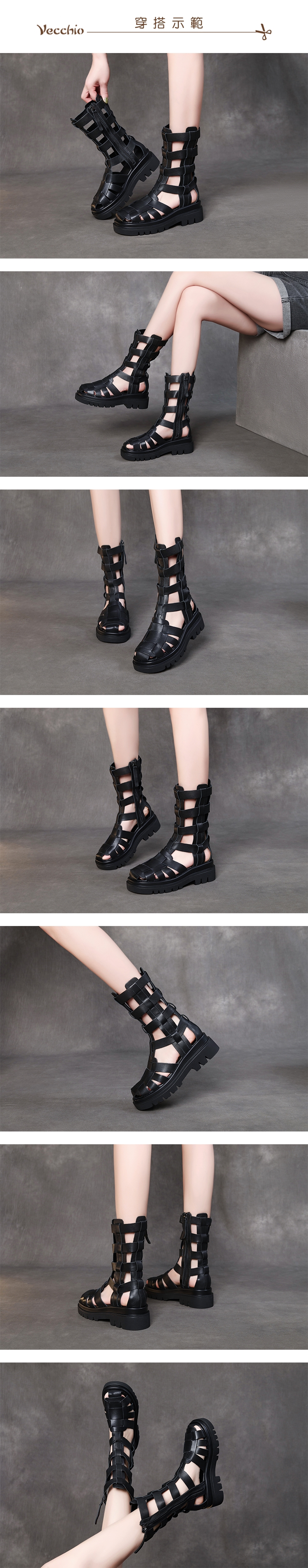 【VECCHIO】真皮厚底羅馬涼鞋/真皮頭層牛皮復古厚底百搭羅馬涼鞋 女鞋 黑