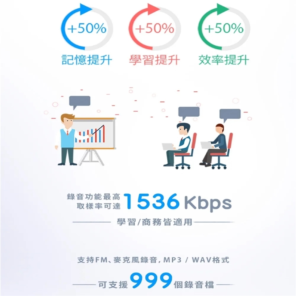 WAV格式無損錄音最高取樣率可達1536Kbps,學習/商務皆適用