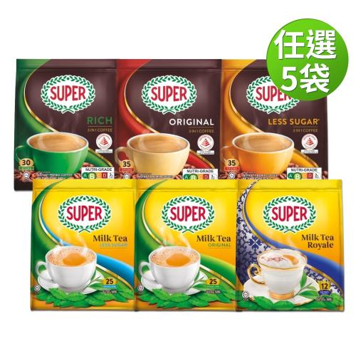 【SUPER-超級】三合一即溶咖啡/奶茶系列 X任選5袋組 (口味任選)+贈【SUPER】超級保溫杯(贈完為止)