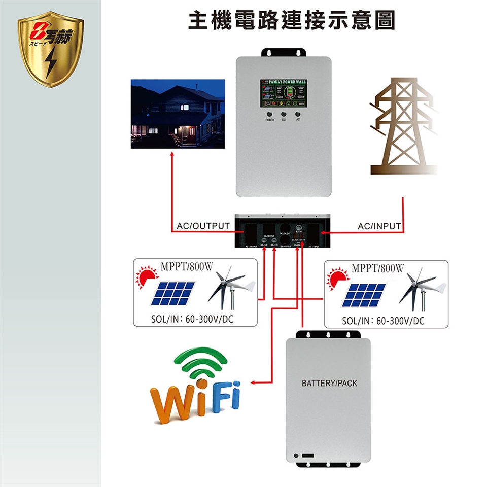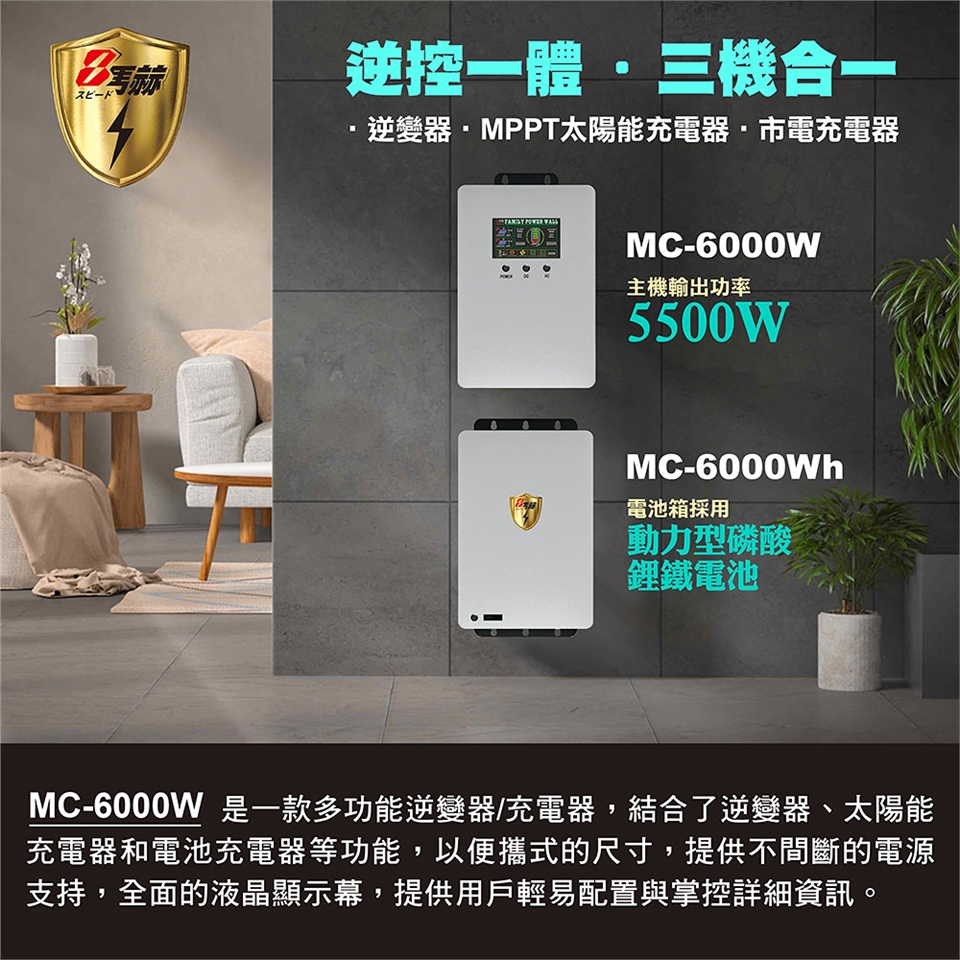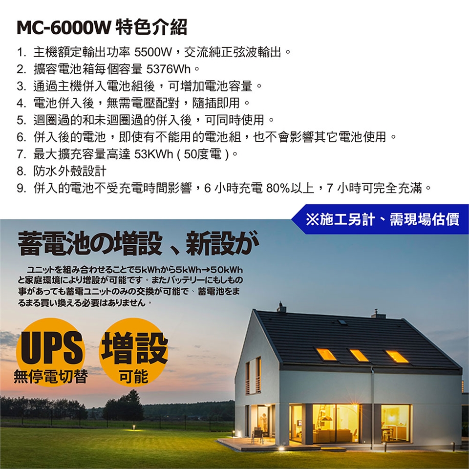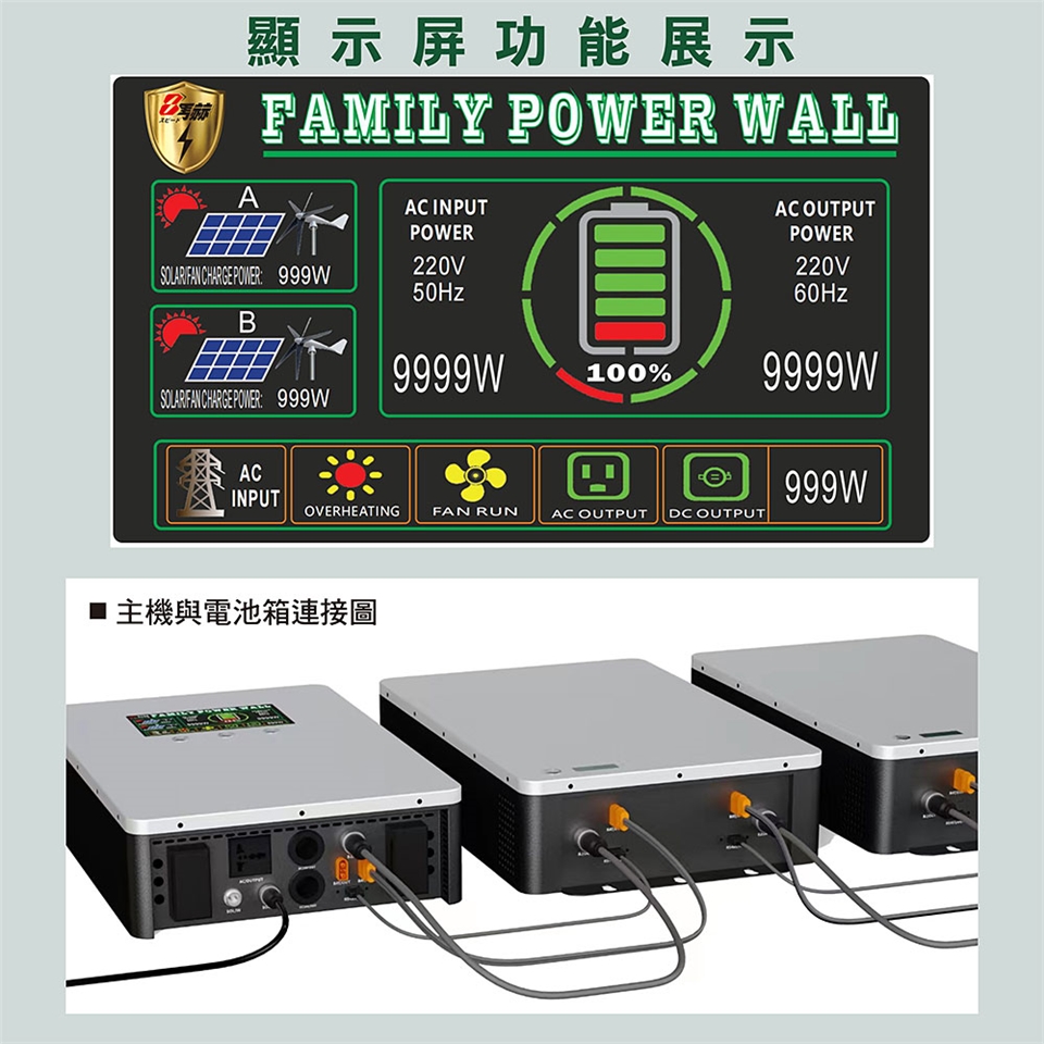 MC-6000W 我公司最新推出的一款家用光伏儲能系統,通過主機與電池箱並聯後,可隨時增加電池容量,進而增加使用時間的目的。