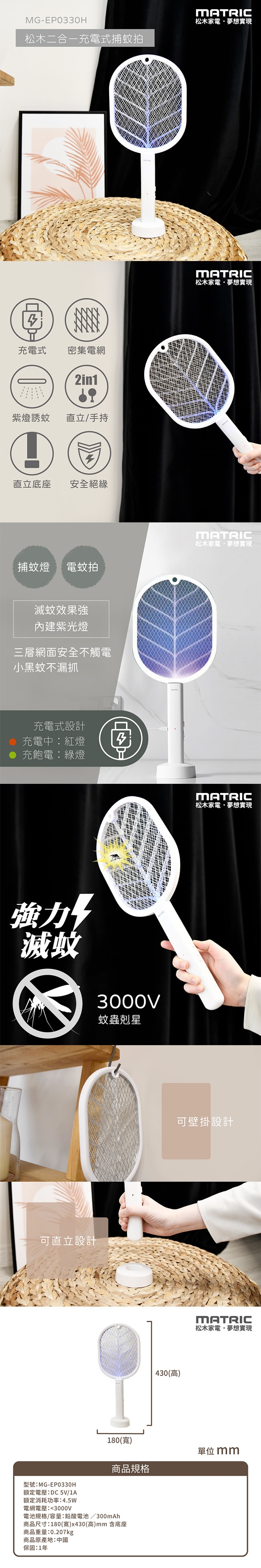 MATRIC松木  二合一USB充電式捕蚊拍/捕蚊燈 MG-EP0330H