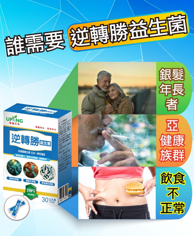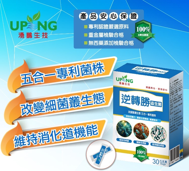 本產品採用五合一專利菌株,特殊的低溫研磨設備,多層包埋微粒結構,能完整通過胃酸,直達腸道,每包含100億專利益生菌,奶素可食,即開即食,攜帶方便,同時有完整動物試驗,能讓您重返年輕狀態、改變細菌叢生態、維持消化道機能、翻轉您的勝利人生!!