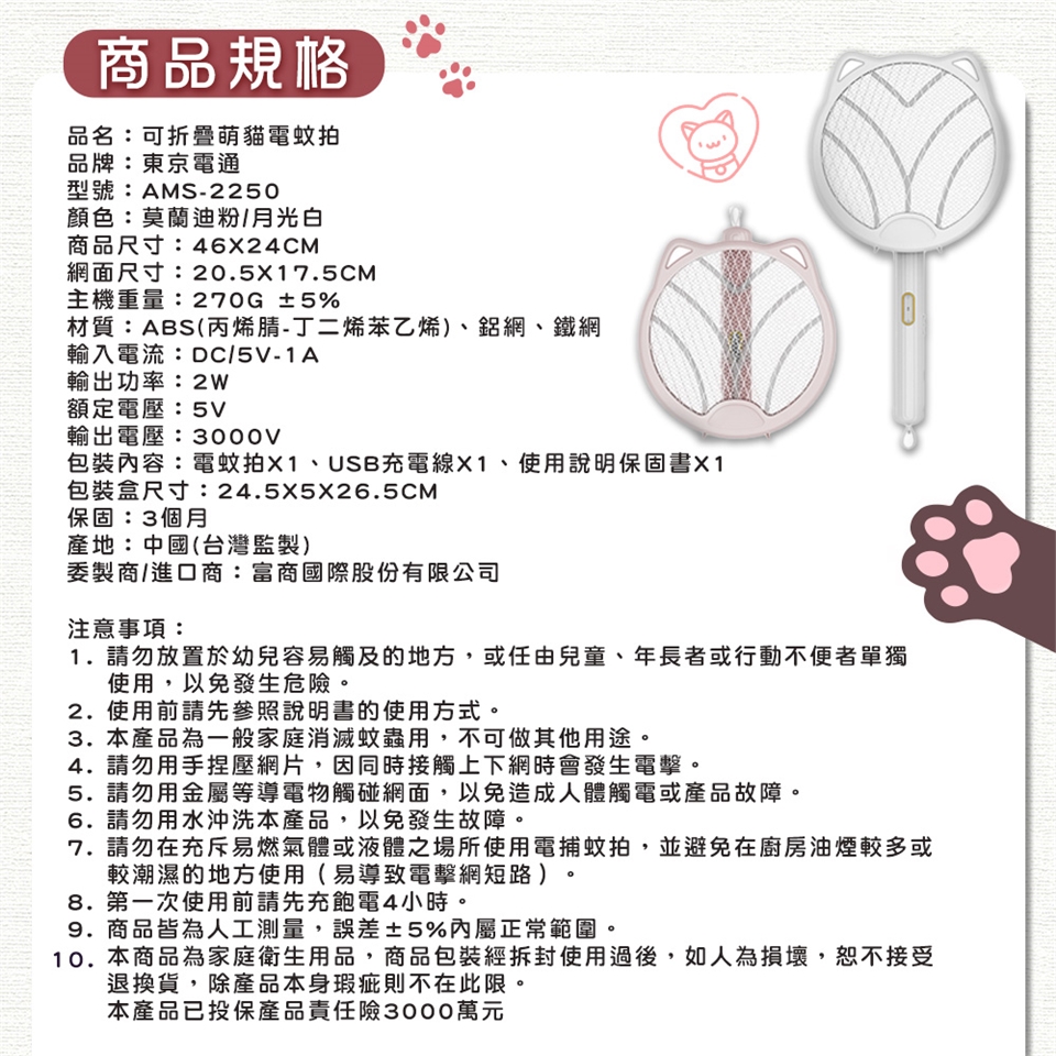 包裝內容:電蚊拍x1、USB充電線x1、使用說明保固書x1