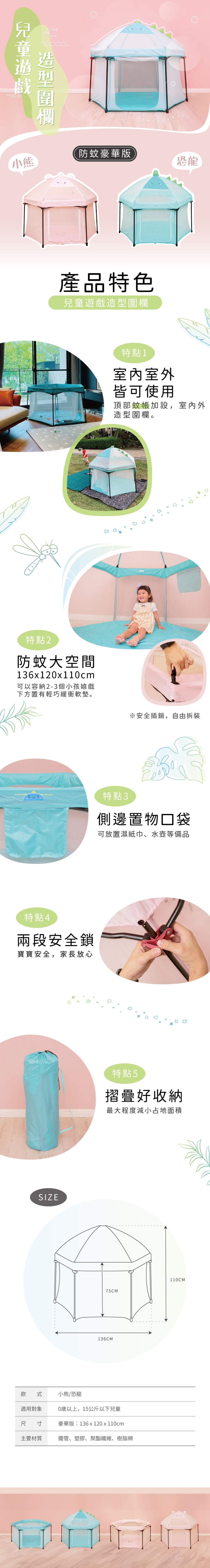 可愛動物設計圍欄,有頂上蚊帳,摺疊好收納。可放在兒童房、客廳,也可攜帶到戶外使用。