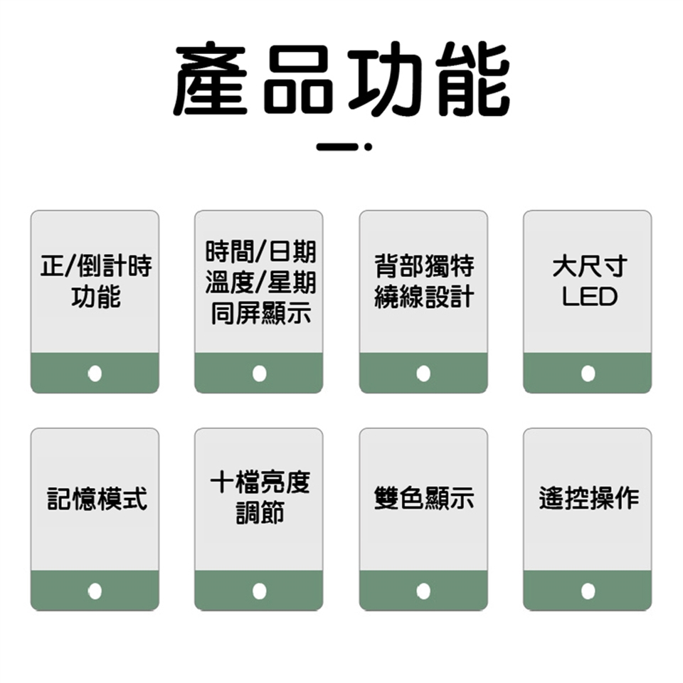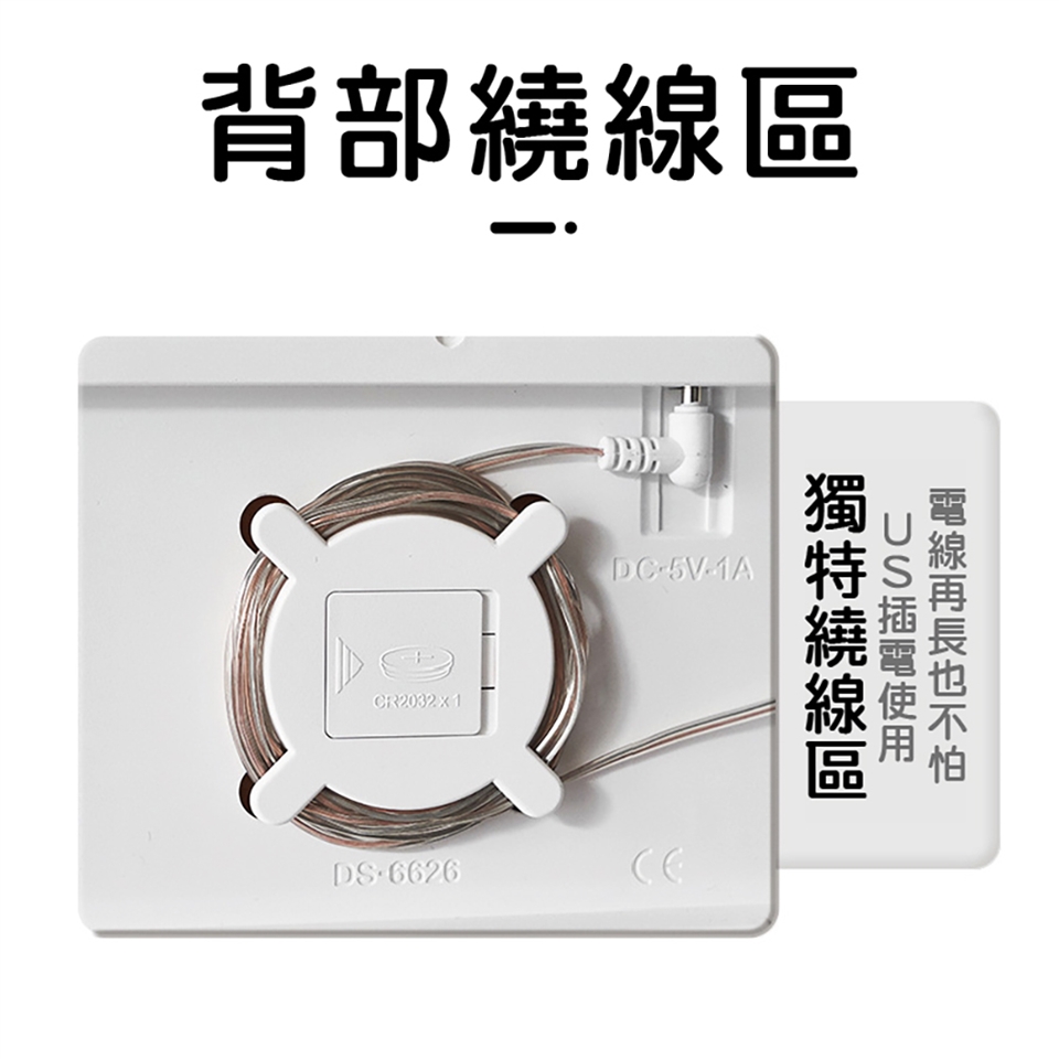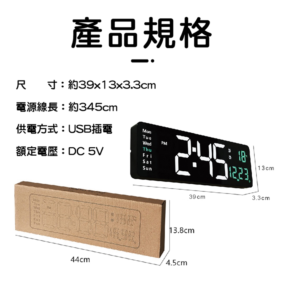 內容物:時鐘*1、電源線*1、遙控器*1、壁掛釘*2、鈕扣電池*2、說明書*1