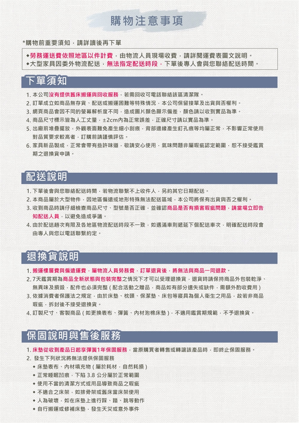 ◆床墊從收到產品日起享彈簧1年保固服務,當原購買者轉售或轉讓該產品時,即終止保固服務。