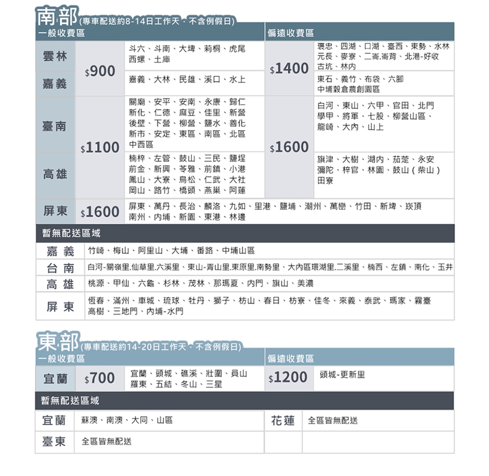 ◆勞務運送費依照地區以件計費,由物流人員現場收費,請詳閱運費表圖文說明。