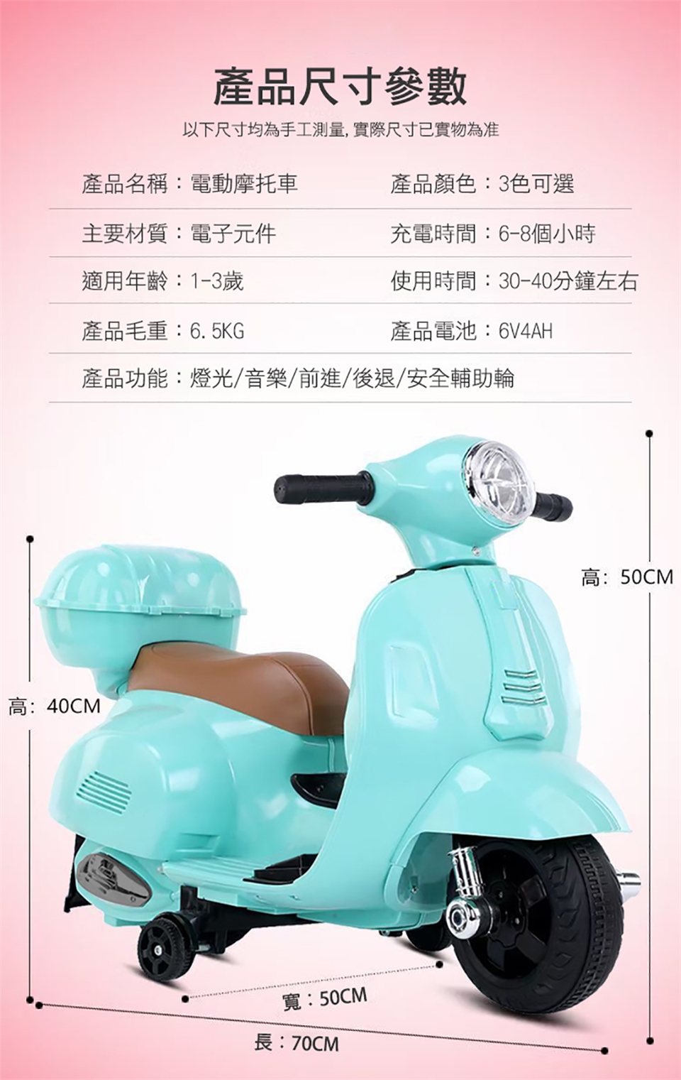 車子尺寸:龍頭到地面:50cm|置物箱到地面:40cm|寬:50cm|長:70cm