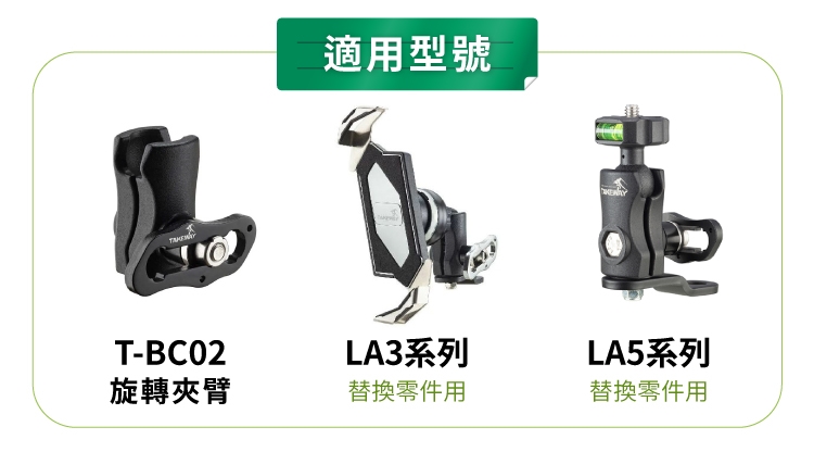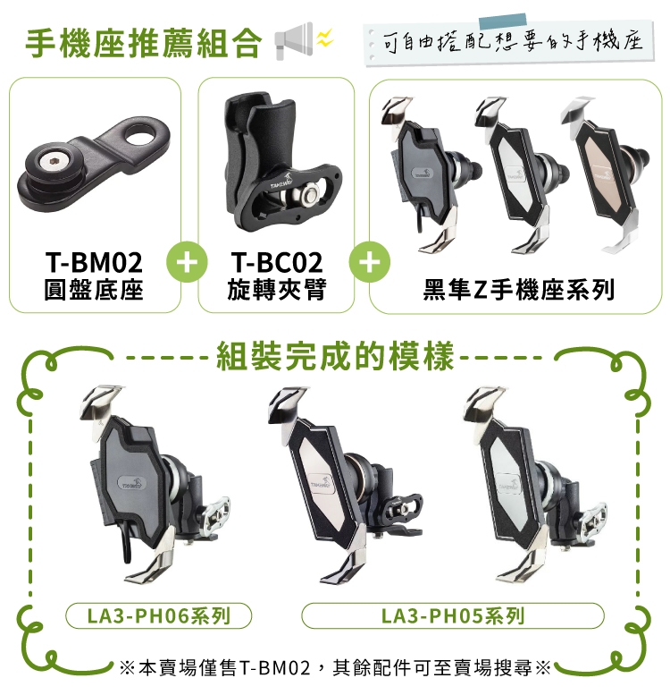 ●可與T-BC02旋轉夾臂,再加上黑隼Z系列手機座,可搭配成完整一套機車手機架系統。