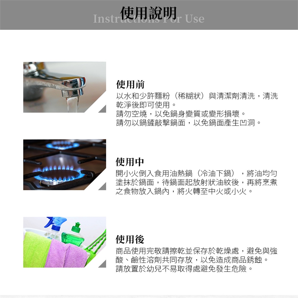 1.請勿讓鍋具大火空燒過久,以免鍋身變質或變形、損壞。